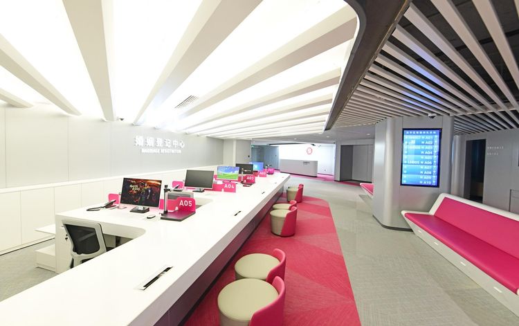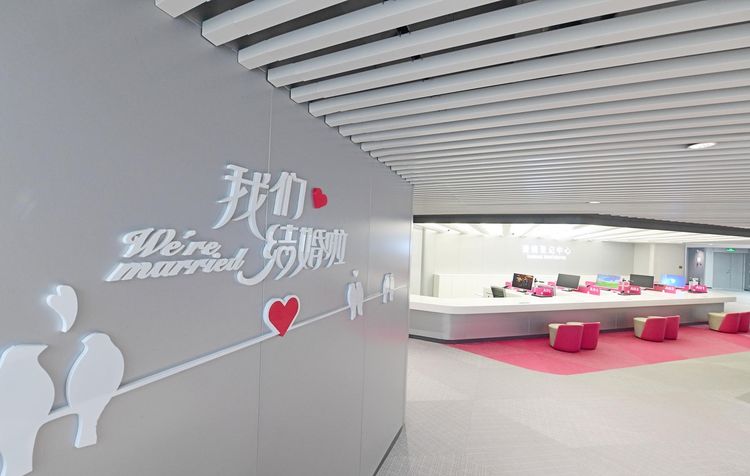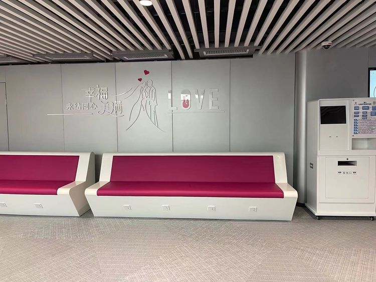 龙华区婚姻登记中心位于区新政务中心(复兴城B座)二层,总面积约400平方米, 以粉色为主色调,打造出现代简约时尚温馨的登记环境。