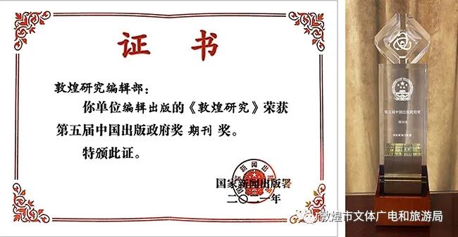 《敦煌研究》荣获第五届中国出版政府奖期刊奖证书、奖杯。中国出版政府奖由国家新闻出版总署主办,是我国新闻出版领域的最高奖,该奖依据2005年出台的《全国性文艺新闻出版评奖管理办法》实施评选,旨在表彰和奖励国内新闻出版业优秀出版物、出版单位和个人。2007年首次评选,每三年评选一次,设有“图书奖(含荣誉奖)”“音像制品、电子出版物和网络出版物奖”“印刷复制奖”“装帧设计奖”“先进出版单位奖”“优秀出版人物奖”等类别的正式和提名奖项,第二届增设“期刊奖”。此次,第五届中国出版政府奖评选了242个正式奖励数额,其中期刊奖20个。期刊奖评选首先由各省新闻出版管理局初审、推荐,国家新闻出版署聘请专家组成评审委员会,本着公平、公正、科学评定的原则,分社会科学、科学技术两个类别分组评选,评选出具有大力弘扬中华优秀传统文化,振奋中华民族精神,激发文化创新创造活力,挖掘整理、保护传承和发展创新民族文化遗产,深入研究阐释中华优秀传统文化蕴涵的思想观念、人文精神、道德规范,推动中华优秀传统文化创造性转化、创新性发展的优秀期刊。