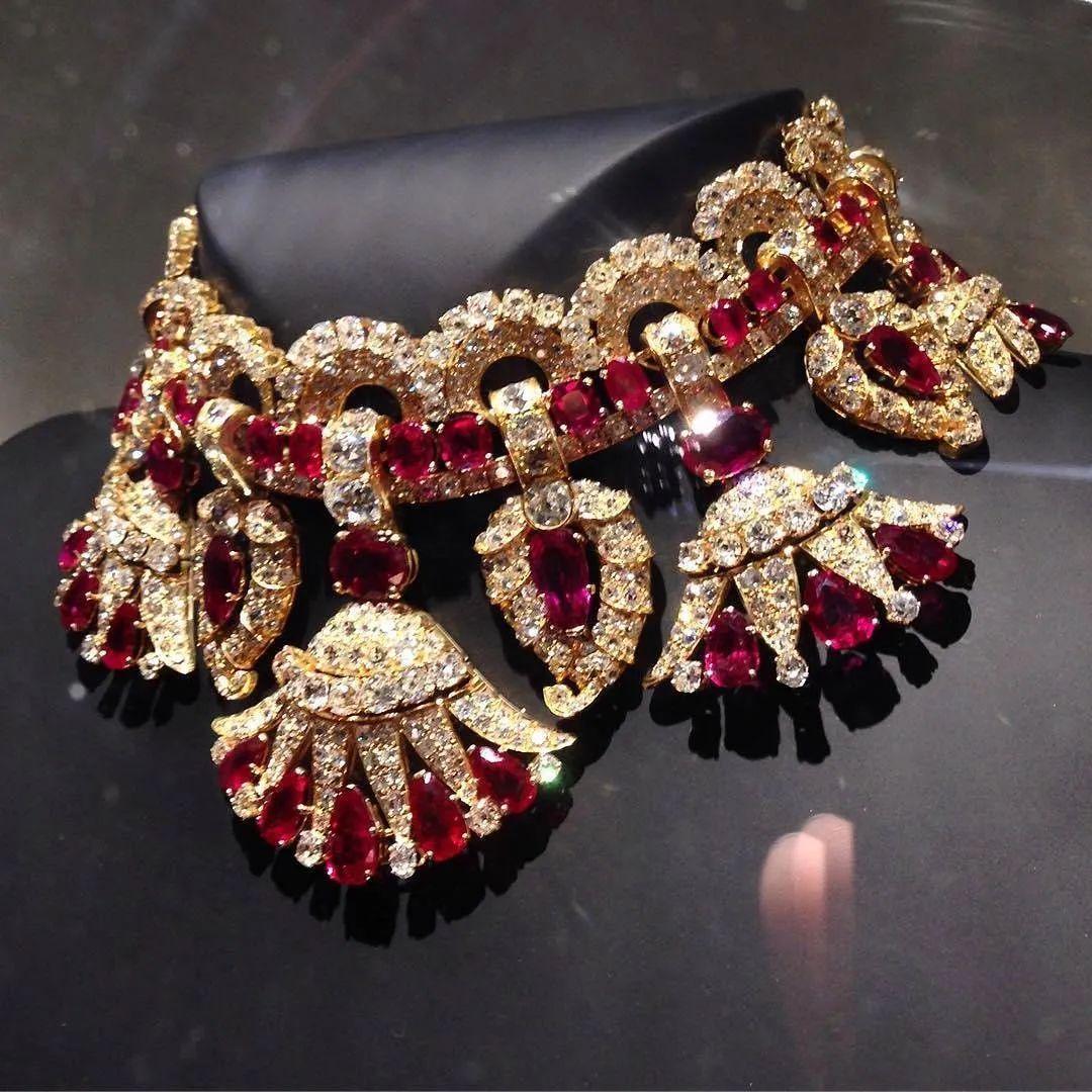 这条卡地亚打造的红宝石项链也可戴做冠冕,其莲花式的设计有着浓郁的东方色彩。采用黄金而不是彼时盛行的铂金制作,也体现出芭芭拉在珠宝方面独到的品味。自幼芭芭拉即表现出对红宝石的钟爱,这副有如蕾丝衣领的红宝石项链据说来自葡萄牙王室,在她年轻和年老时均常佩戴。