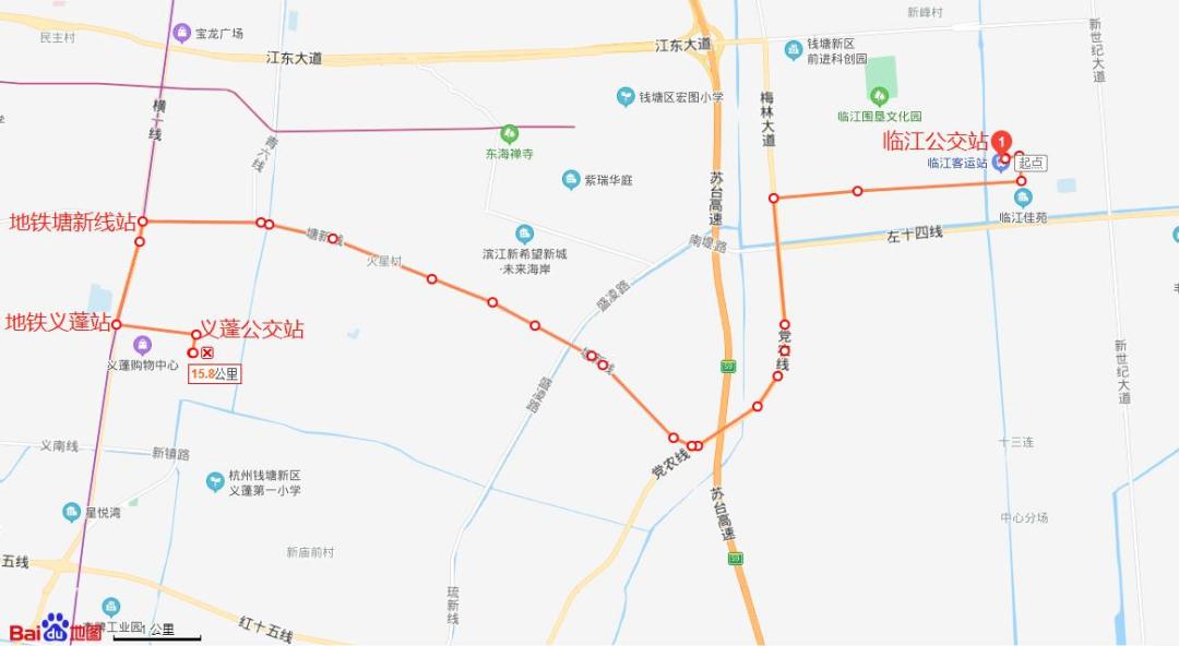 临江公交站始发,经富达街、佳苑路、纬六路、梅林大道、塘新线、青六路、义府大街、义盛路至义蓬公交站。