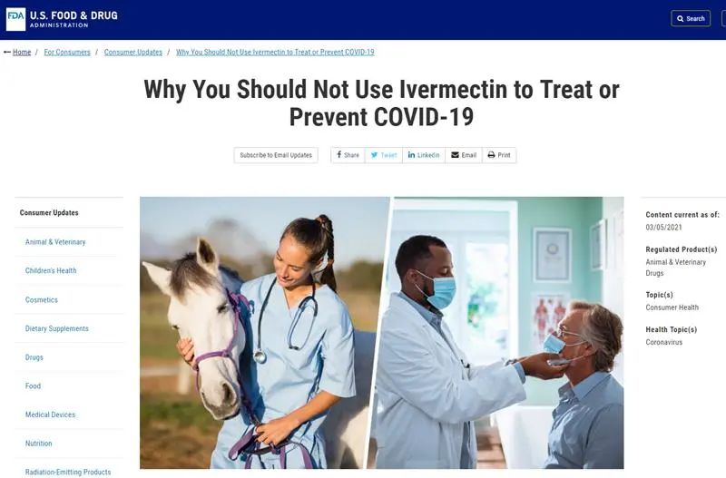 FDA也在官网上发文《Why You Should Not Use Ivermectin to Treat or Prevent COVID-19》指出:FDA尚未批准伊维菌素用于治疗或预防人类COVID-19。伊维菌素不是抗病毒药物,大剂量服用这种药是非常危险的,会造成严重的伤害。