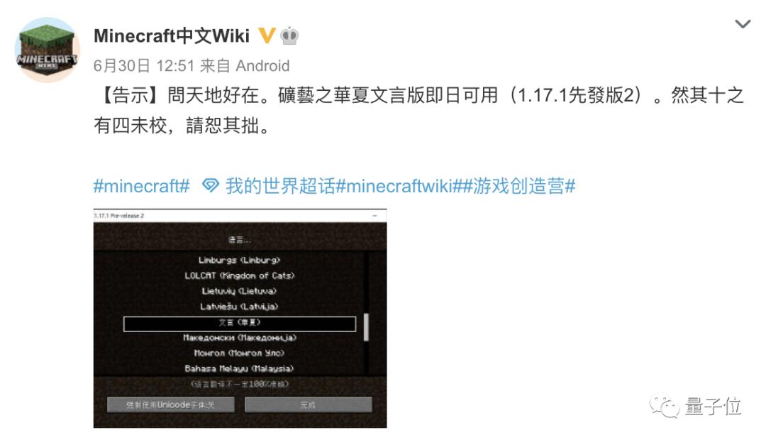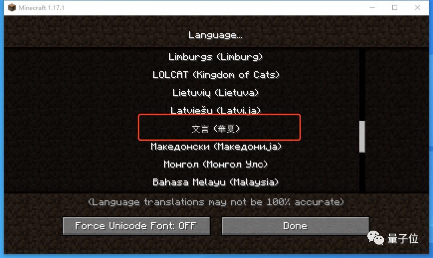 在更新的《我的世界》1.17.1版本中,文言文已被正式列入语言选项。