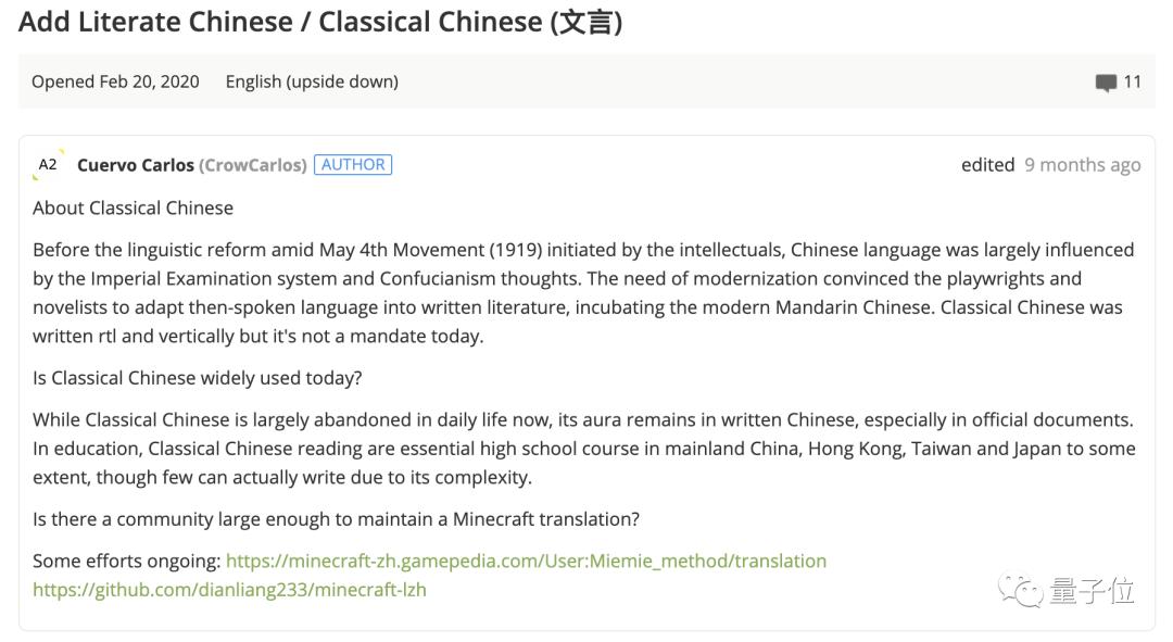 于是,2020年2月份,MCwiki的一位编辑成员就向MC官方提交了文言申请: