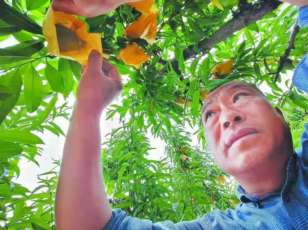 “人均一亩桃,走上致富路。丰产的桃树亩产在5000斤左右,2元一斤算价格低的了,好的品种可以卖到6元以上。”5月31日,说起村里的桃林,52岁的村党支部书记朱前程打开了话匣子。朱启广正在套袋的黄桃,就是朱前程口中“好的品种”。