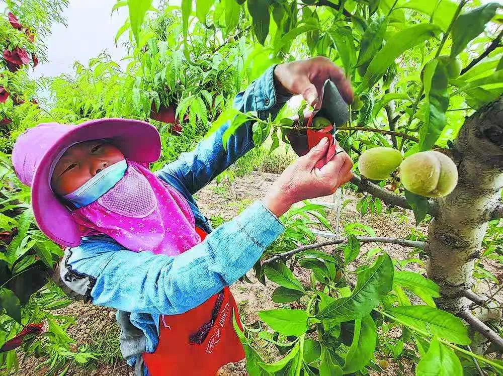 朱启广正在给桃子套袋