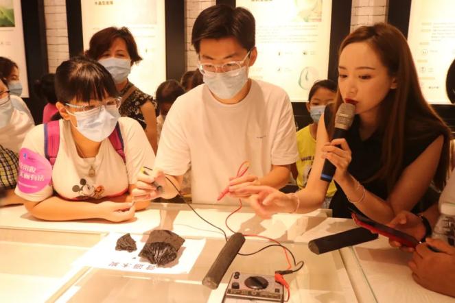 以备长炭为原料制成的膜布有什么特别之处?在贝豪的面膜文化展厅,工作人员通过电导率测试,向街坊展示备长炭与普通木炭的区别。在这里,街坊们还能了解到不同形式的面膜和不同种类的膜材。