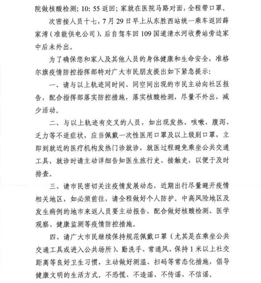 2021年7月30日,土默特右旗疾控中心收到陕西省应对疫情领导小组办公室协查函,我旗居民董某为新冠病毒阳性感染者的密切接触者。董某于7月21日19:30从西安南站乘坐K692次车于7月22日7:02到达包头站,7月23日乘坐私家车于13:00左右抵达萨拉齐。现董某已进行集中隔离。与董某7月22日到7月30日在包头市区、土右旗活动期间密切接触人员存在潜在感染风险。请与董某行程轨迹重合或同车(厢)人员主动与当地疾控中心联系,配合有关部门做好核酸检测及医学观察。