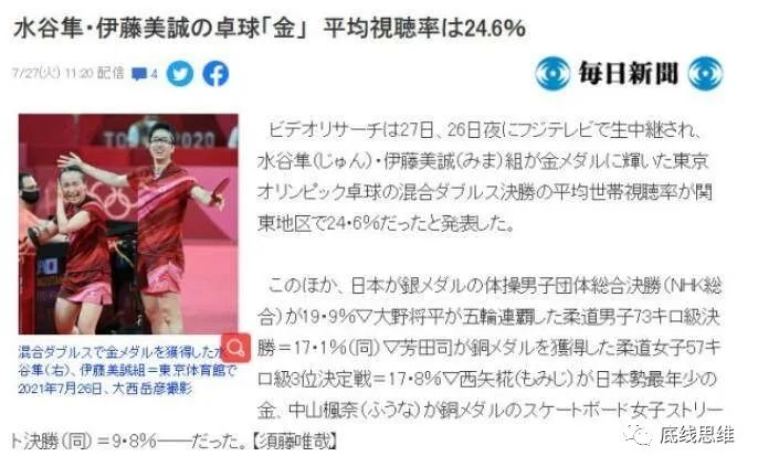 不过,这种反对又随着比赛日程的推进发生着微妙的变化。7月26日,奥运会乒乓球混双决赛上,日本选手伊藤美诚和水谷隼组合击败中国运动员刘诗雯和许昕组合,登上冠军宝座。获胜的喜悦一时间传遍日本,“打败王者中国”的新闻登上日本各大媒体头条。