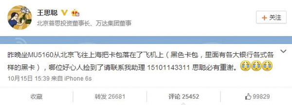 胡润研究院昨日发布了《2015胡润百富榜》,其中王健林坐拥2200亿财富再度成为中国首富,然后他儿子转眼就把黑卡丢了,而且还是各式各样的黑卡,这难道不是花式炫富?因为就王思聪而言,在飞机上丢了东西,把飞机买下来就好了,还找啥找?