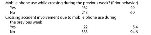 Jiang,Ling,Feng,Wang,Guo. (2016). Psychological predictors of mobile phone use while crossing the street among college students: an application of the theory of planned behavior. Traffic Injury Prevention, 118-123.