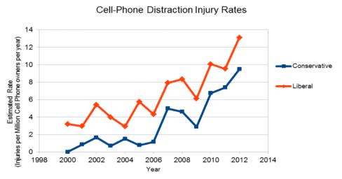 美国国家电子设备伤害监控系统(NEISS)在2004至2010的数据指出,美国行人使用手机造成的伤害在交通事故中占比在这7年间增长了近10倍。其中,自 2006 年起行人因手机分心而发生事故的数量有爆发式增加。