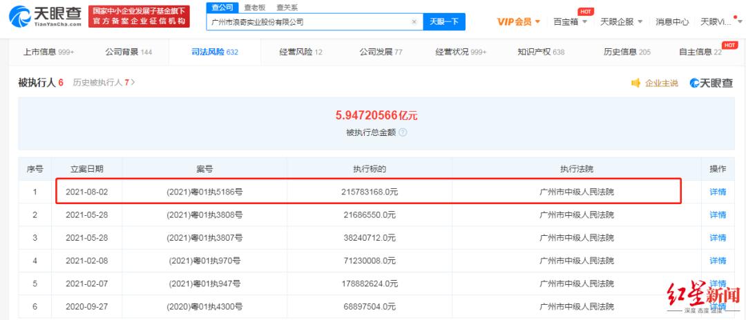 天眼查APP显示,8月2日,广州市浪奇实业股份有限公司(以下简称“广州浪奇”)新增一则被执行人信息,执行标的2.16亿元,相关案号(2021)粤01执5186号,执行法院为广州市中级人民法院。
