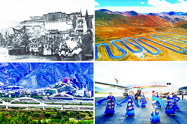 左上图:1954年12月25日,川藏、青藏两条公路胜利通车到拉萨,在布达拉宫广场上举行盛大通车仪式;左下图:青藏铁路列车经过拉萨;右上图:通往珠峰的公路;右下图:西藏航空有限公司正式开航。