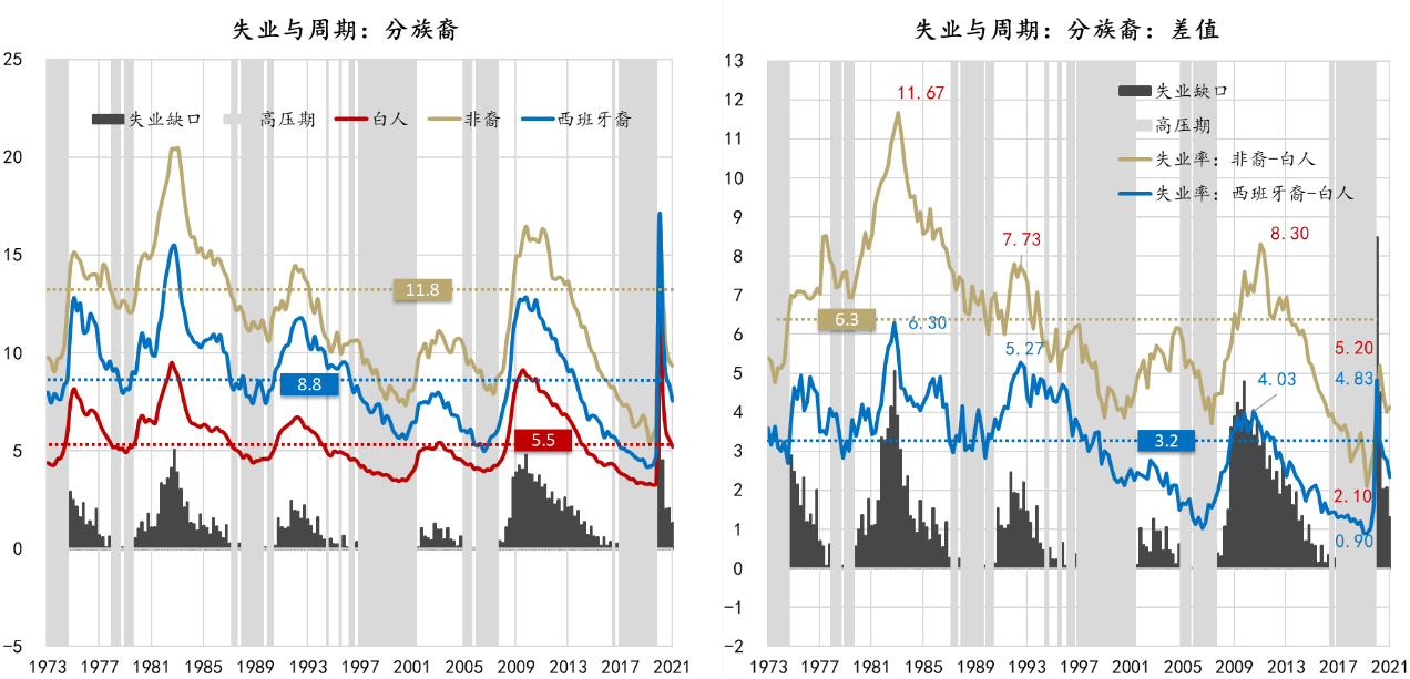 例如,当经济遭遇负冲击时,非裔和西班牙裔劳动者的失业率的平均增幅远高于白人。阶层分化还体现在时间维度。弱势群体往往是最先被解雇和最后被雇佣的——在劳动市场复苏的早期(失业缺口为正),受益的主要是优势群体,只有当劳动力市场呈现出“高压”(high-pressure)状态(失业缺口为负)之后,弱势群体才更加受益。他们与优势群体的失业率差距会缩小,工资涨幅甚至更高。所以,劳动市场的高压状态维持地越长,就越有助于推动社会阶层的公平。