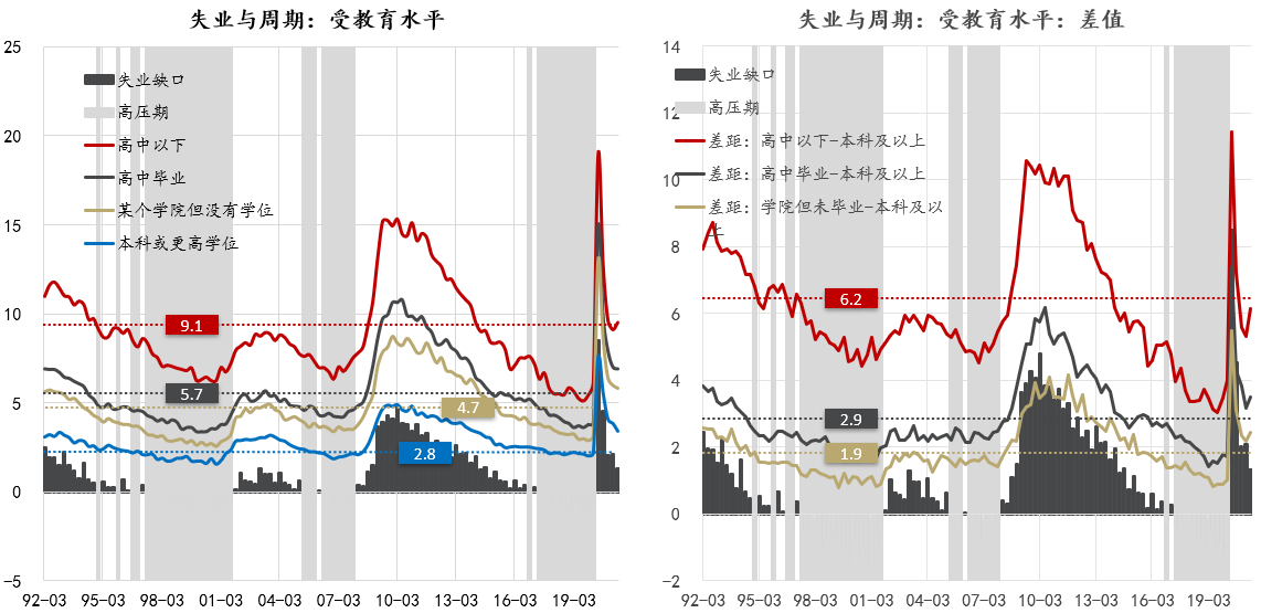 按学历将劳动划分为:高中以下、高中毕业、学院肄业和本科及以上(包括研究生学位),也能观察到类似的群体差异——学历越高,失业率水平和周期敏感性越低(图2)。近三十年绝对失业率平均值从高到低依次为9.1%、5.7&、4.7%和2.8%。