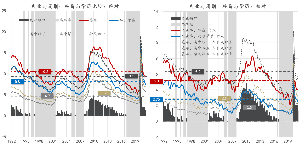 无论是大危机,还是大流行期间,“高中以下”群体的相对失业率的上升幅度都更加显著。在大危机期间,“高中以下”群体的相对失业率从5%升至11%,非裔从3.7%升至8.3%。大流行期间,前者从3%升到了11%,后者从2.1%升到了5.2%。