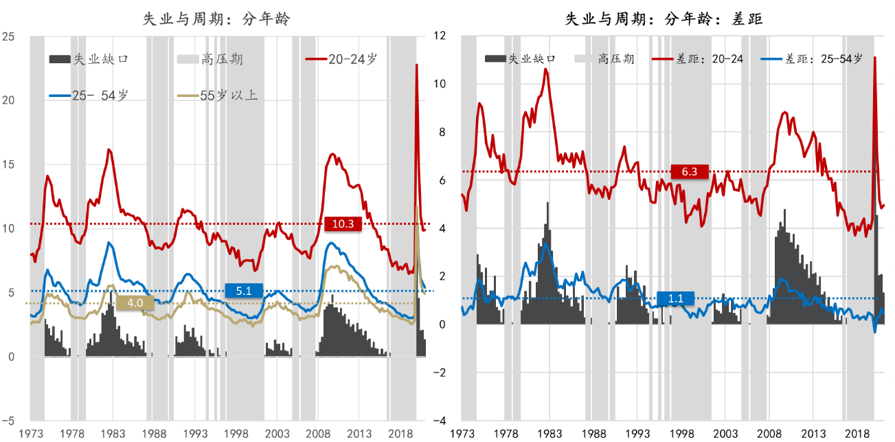 分性别而言,1973年以来,男性与女性的平均失业率基本相同,分别为6.28%和6.33%,但男性失业率的周期敏感性略高于女性。例如,2009年底,男性失业率升至11.0%,女性升至8.5%,二者相差3.5个百分点。