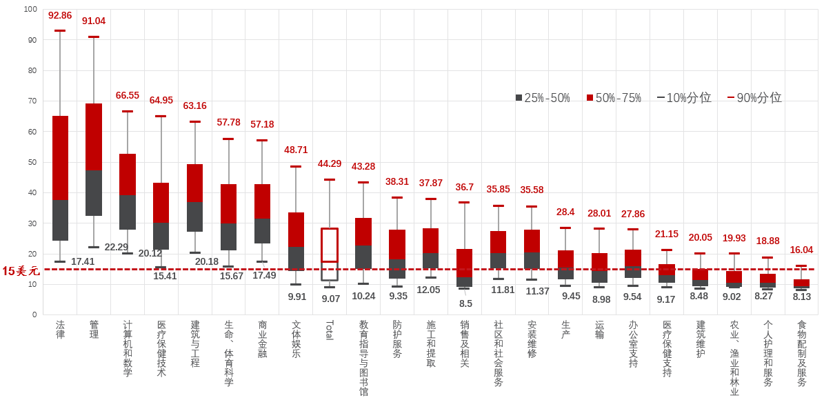 美国劳动市场的群体差异还可以从工资维度去观察(图5)。分行业而言,法律、管理、计算机与数学、医疗、生命科学等都属于高薪行业,农业、个人护理及服务、食物配置及服务等属于低薪行业——中位数工资低于拜登政府计划推动最低工资(15美元/小时)。