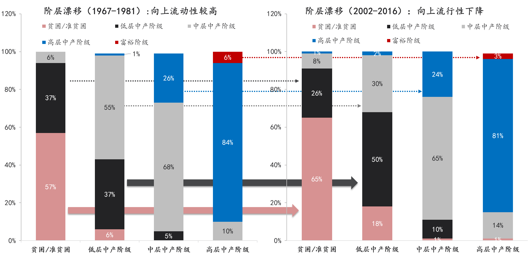 贫困或准贫困阶层维持原状的比例从57%增加至65%,升至中产阶级的比例从43%下降至35%。低层中产阶级维持原状的比例从37%增加至50%,升至更高阶层的比例从56%下降至32%,向下流动的比例从6%增至18%;高层中产阶级维持原状的比例从68%下降至65%,但向上流动的比例从26%下降到24%,反而向下流动的比例从5%增加至11%;高层中产阶级维持原状的比例从84%下降至81%,变为富裕阶层的比例从6%下降到3%,向下流动的比例从10%增至15%。
