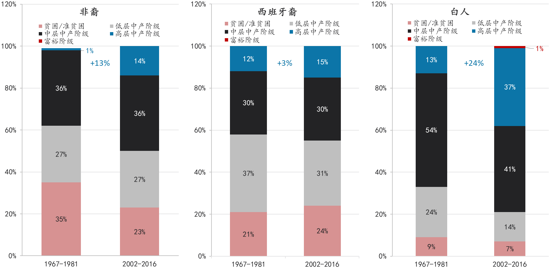 分族裔看(图8),在任意时间段,相比白人而言,非裔和西班牙裔在低层中产及以下阶层分布比例都比较高,在中层中产及以上阶层分布的比例则更低。两个时间段比较而言,西班牙裔整体状况在恶化,贫困/准贫苦比例增加了3个百分点;非裔和白人的贫困/准贫困人口比例都有所下降,差距主要体现在高层中产阶级占比的变化上,非裔从1%增加至14%,白人则从13%增加至37%。