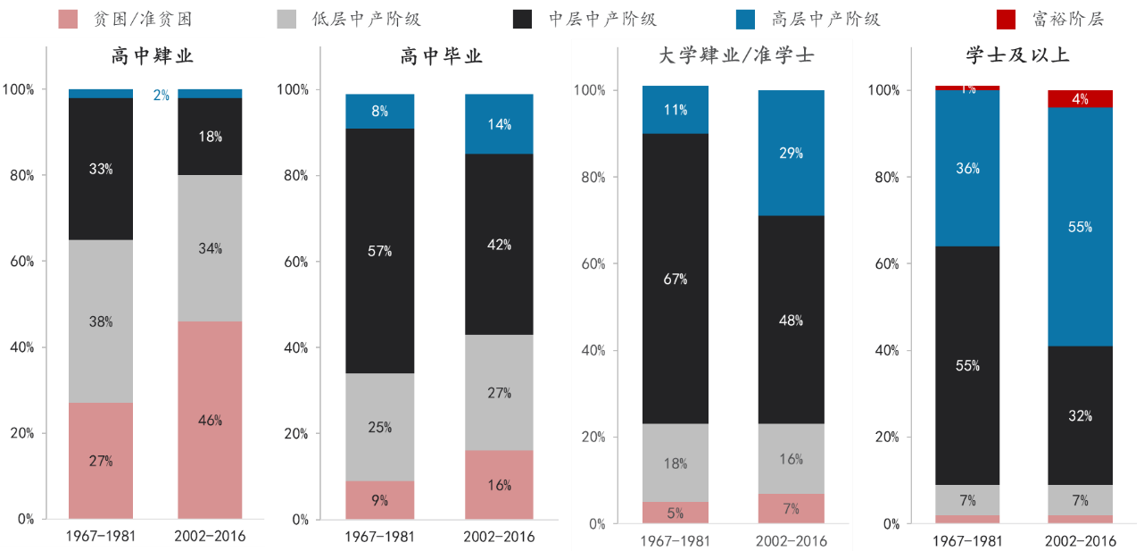 分学历而言(图9),可得到类似的结论,高中肄业或高中毕业的弱势群体分布在贫困/准贫困阶层和低层中产阶级的比例显著高于高学历人群。与上世纪相比,就在中层中产及以上阶层分布的比例而言,高中肄业从35%下降至20%,高中毕业从65%下降至56%,大学肄业/准学士和本科及以上学历维持不变;但是,他们在高层中产及以上阶层分布的比例大幅提升,尤其是对于本科及以上学历人群。