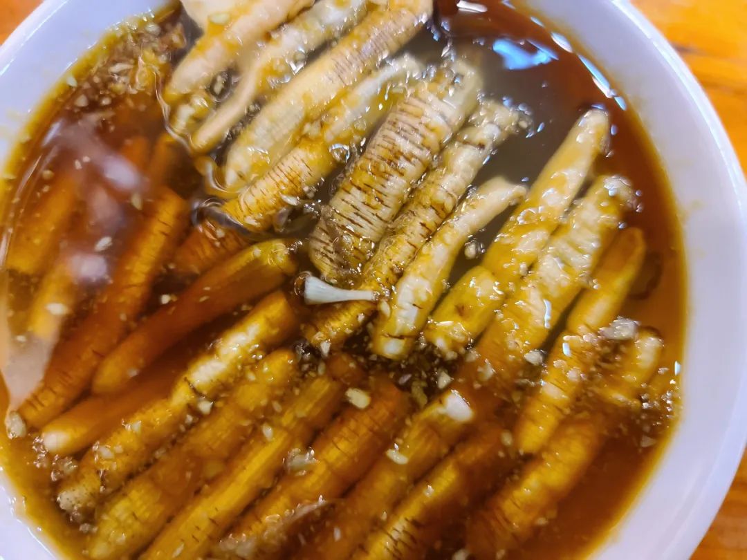 weibo@Fangzizs采用生长于海边滩涂的“土蚯”洗净泥沙,旺火烧制,海虫的胶质瞬间融入水中,冷却后成了土笋冻,晶莹的外表,口感柔韧爽脆,鲜甜爽口。炎炎夏日,只需小小的一碗再加上一点蒜蓉酱提味,绝对是最佳解暑冰品。即使是在寒冷的冬季,也可以作为解馋的零食存在于泉州人的生活中。
