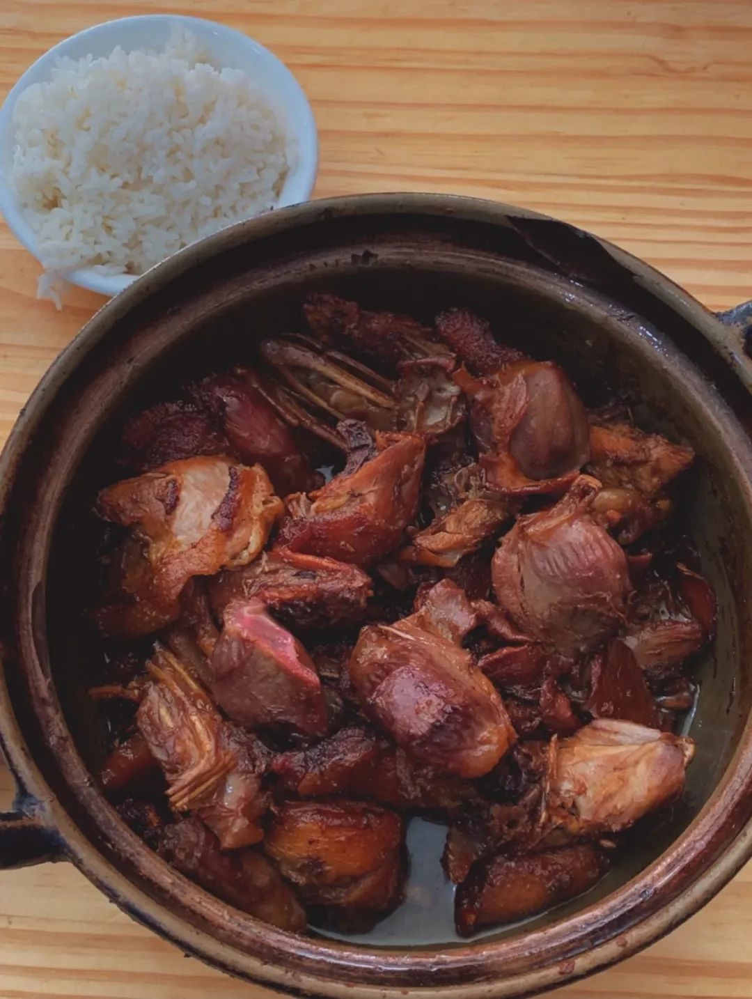 小红书@鸡腿儿是我的借助砂锅的慢炖,生姜切片铺于砂锅底部,鸭肉平铺在姜片上方,小火慢制,直到锅中的鸭肉焖煮到肉干的程度,一道正宗的姜母鸭就正式完工了。