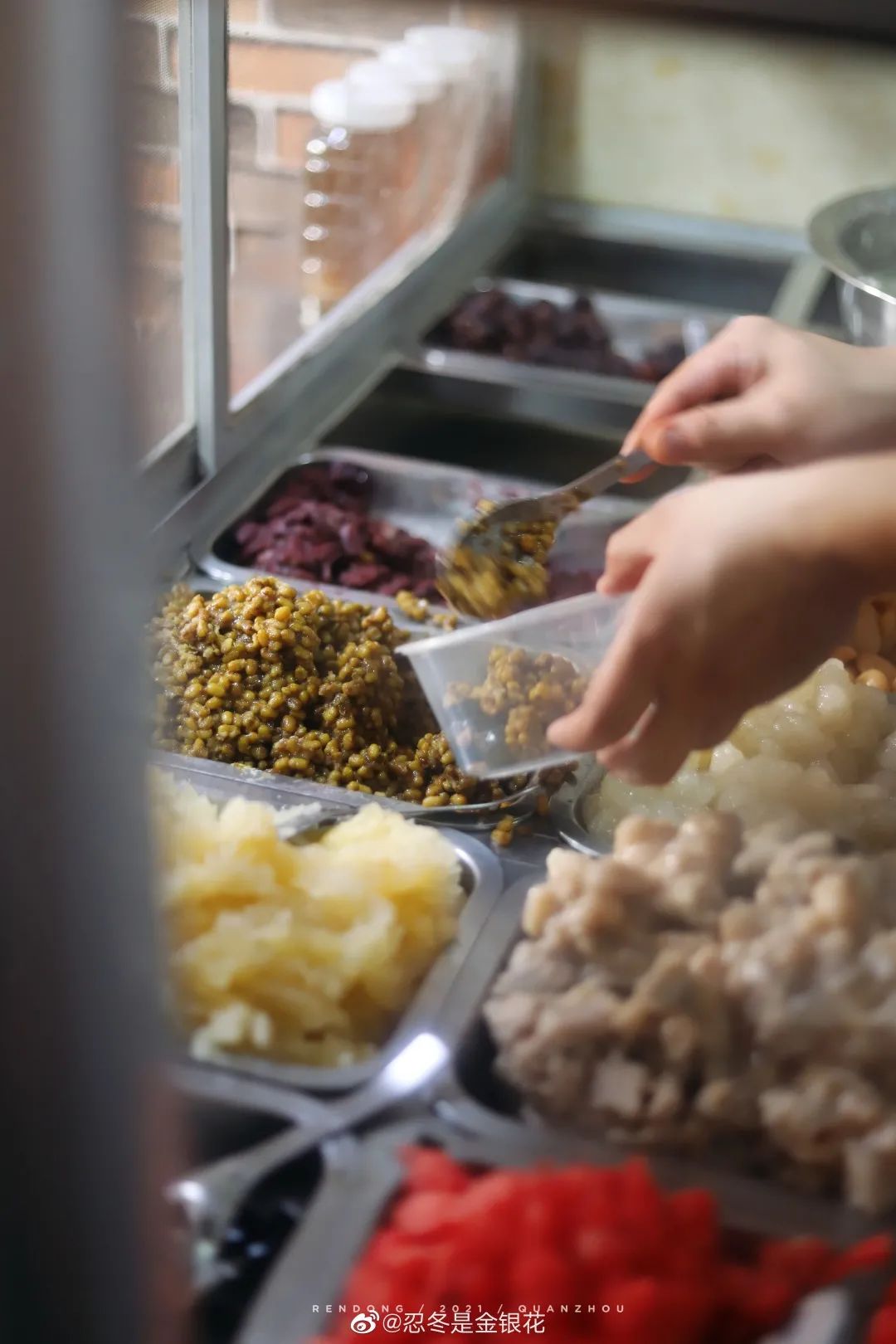 weibo@忍冬是金银花进入店内,首先映入眼帘的是一个个装着各色小料的银色不锈钢盆,煮得软烂的芸豆、软糯 Q 弹的 QQ 果、红豆、芋头等都是店家手工制作而成。亮晶晶偏乳白色的就是石花膏本膏,现买现刮,满满当当的小料遇上了长条状的石花膏,一口下去,是夏天的味道无疑了。