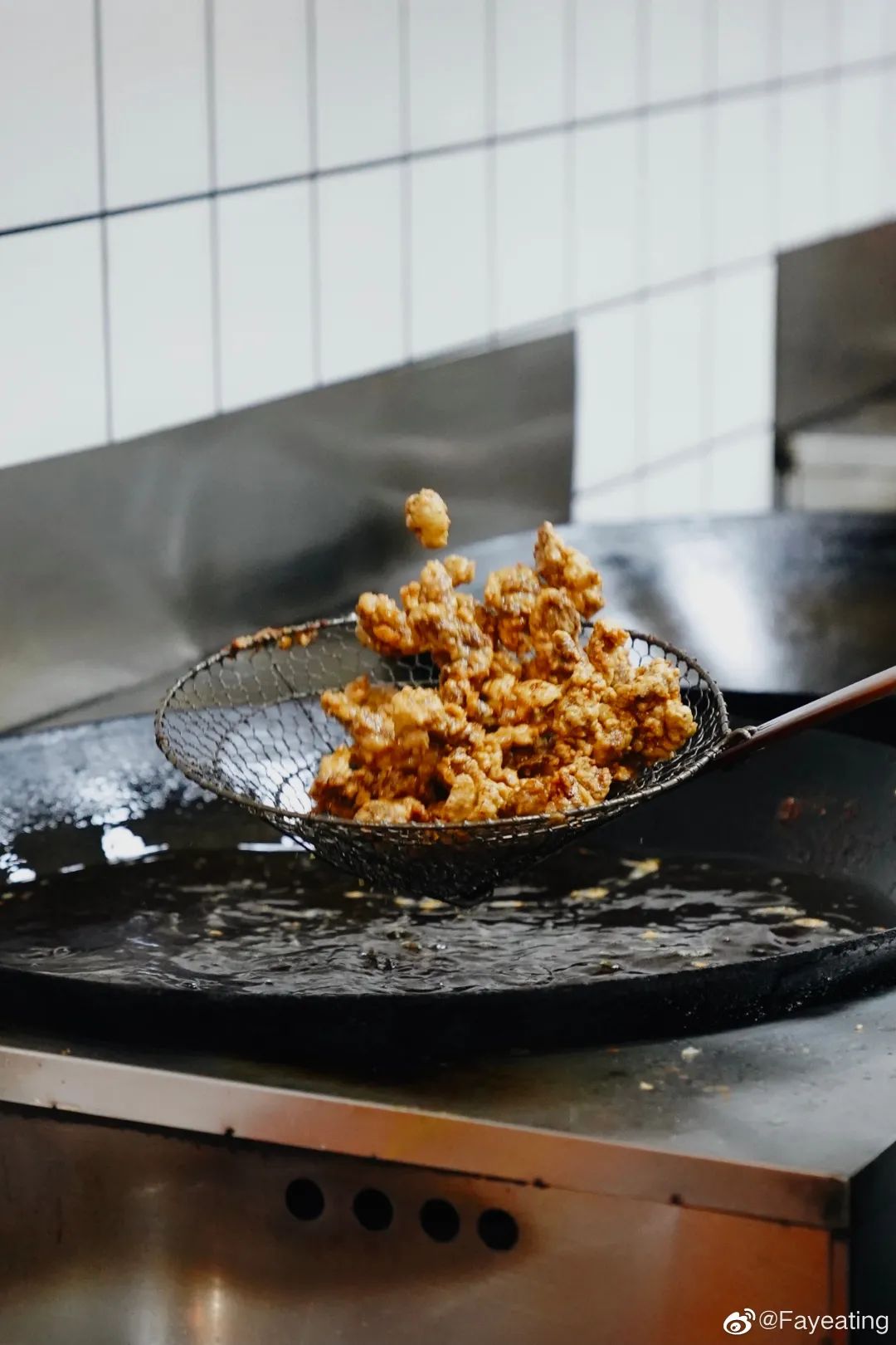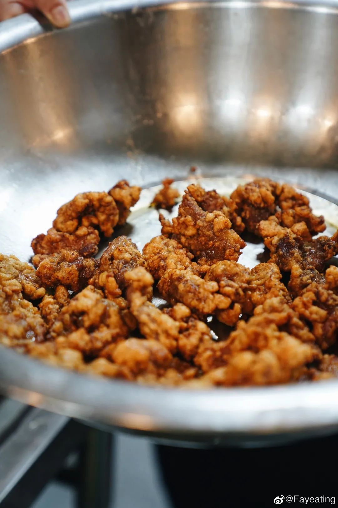 weibo@Fayeating桥仔头醋肉,一家地道泉州人必来的店铺,从前是流动的小推车,如今小推车的背后也有了大店面。每天一大早店铺里的阿姨就要用腌制好的猪瘦肉滚过面粉,一道完美的醋肉讲究两点,其一,面粉必须均匀的粘在腌肉的表面;其二,炸醋肉的火候是关键,老了或者没熟都不是桥仔头醋肉的水准,来的早的话可以赶上第一锅热腾腾的醋肉。