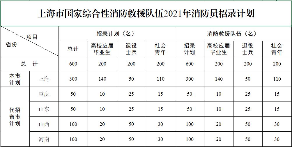 上海市消防救援队伍计划面向社会招录消防员600名(上海市招录300名,重庆市招录50名,山东省招录50名,山西省招录100名,河南省招录100名),其中:公开招录社会青年200名、定向招录退役士兵200名、专项招录高校应届毕业生200名。报名截止时间为8月31日18时。