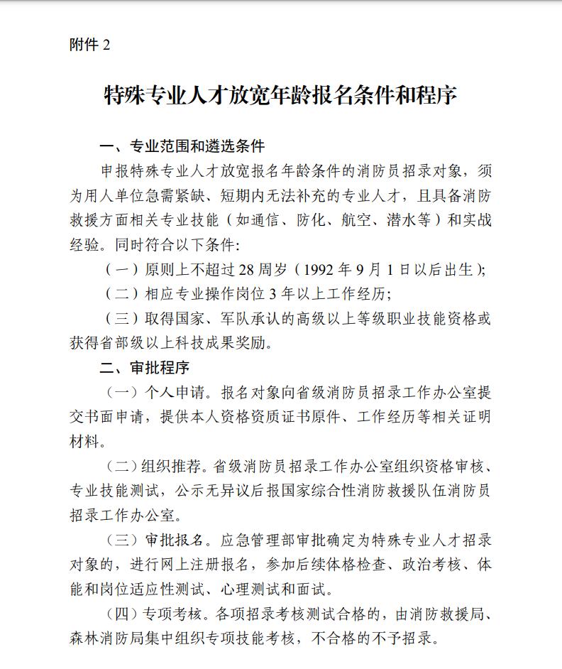 (四)年龄为18周岁以上、22周岁以下,出生时间为1998年9月1日至2003年8月31日。大学专科以上学历人员、解放军和武警部队退役士兵、具有2年以上灭火救援实战经验的政府专职消防队员和政府专职林业扑火队员,年龄可以放宽至24周岁(1996年8月31日以后出生);对消防救援工作急需的特殊专业人才,经应急管理部批准年龄可以进一步放宽,原则上不超过28周岁(1992年8月31日以后出生);