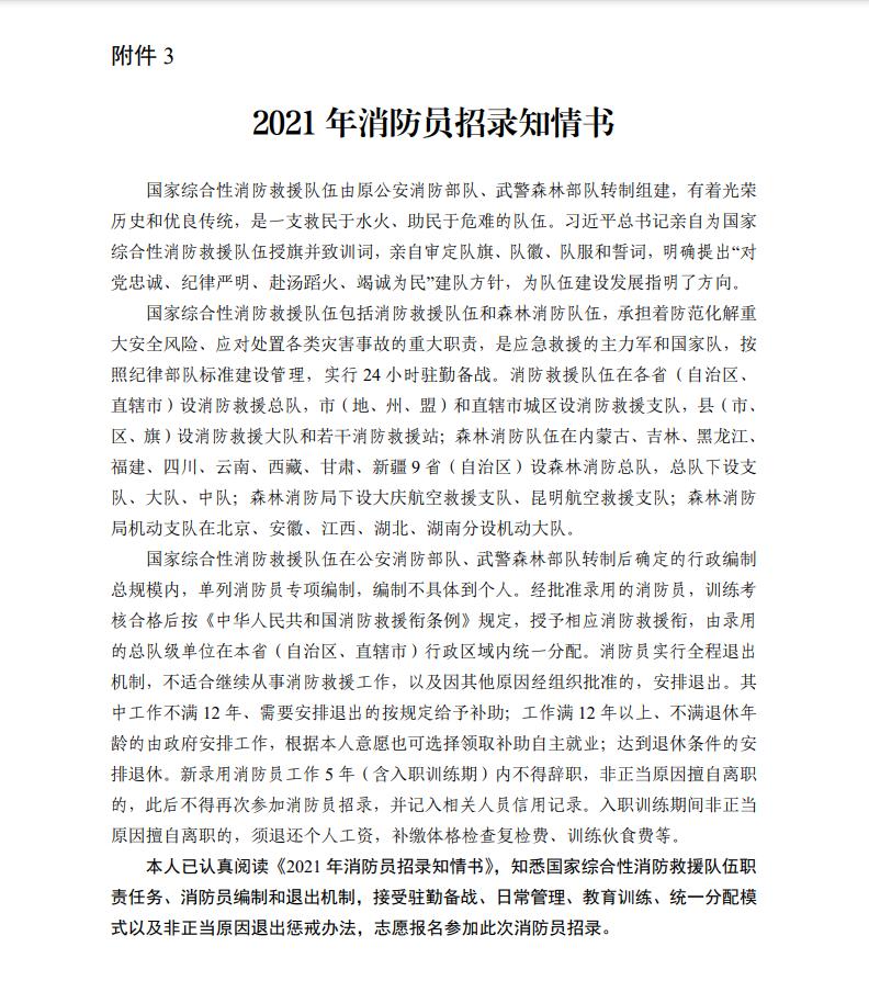 消防员招录坚持信息公开、过程公开、结果公开,主动接受社会监督。此次招录不收取任何费用,不指定考试辅导用书,不举办也不委托任何机构举办考试辅导培训班。招录全程严禁中介机构以代招名义收取任何费用。