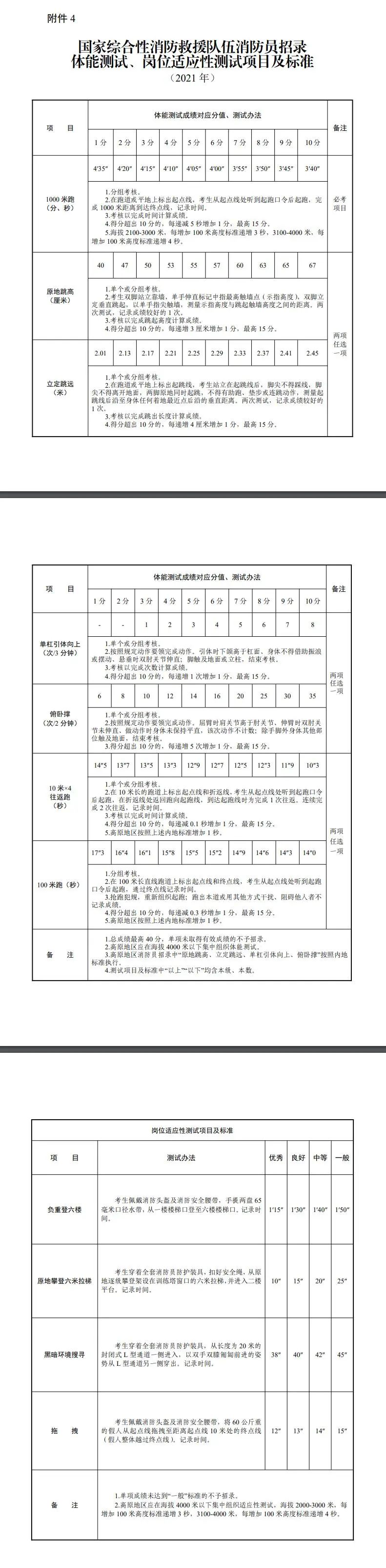 (三)体能测试和岗位适应性测试。按照《国家综合性消防救援队伍消防员招录体能测试、岗位适应性测试项目及标准》执行(见附件4)。单项有效成绩为1分~15分(未取得有效成绩的不予招录),总成绩最高40分。岗位适应性测试单项成绩须在“一般”标准以上。