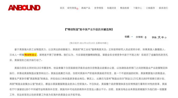 图 | 《“精细制造”是中国产业升级的关键选择》(「 每日经济 」总第4070期,2011/12/13)早在2011年,安邦智库(ANBOUND)创始人陈功就提出了“精细工业”、“精细制造”的概念。所谓“精细工业”,是指那些具有持续创新的设计和材料运用,以及高品质管控下的高价值工业品生产活动和生产体系。