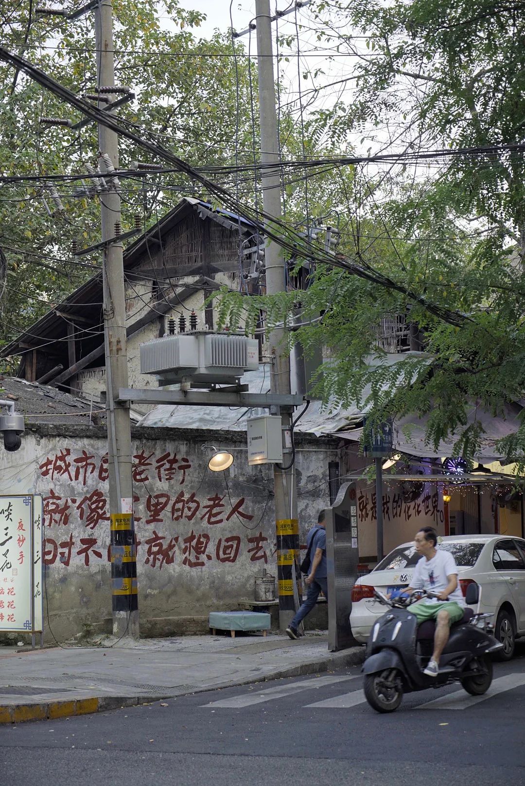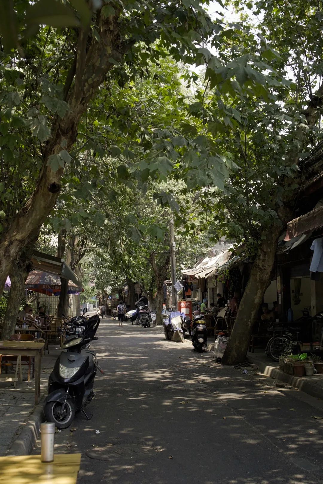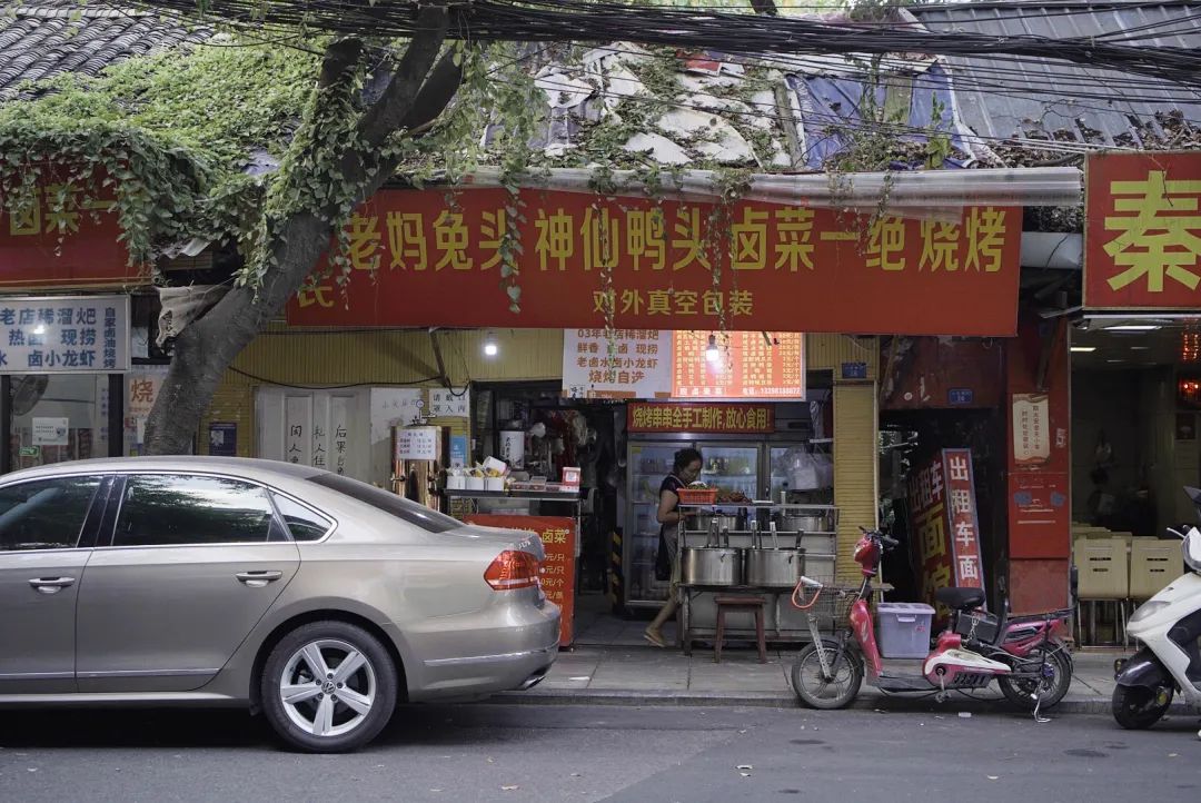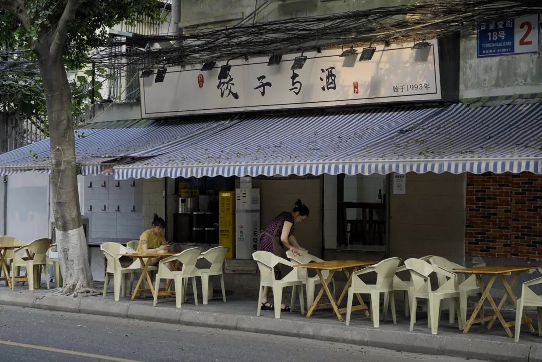 王孃端面端菜上桌时,总是要说一句,“先吃到”。这种打包票式的问候让人踏实安心,也让人很难动浪费粮食的心。低矮的瓦房和茶馆注定了这条街上竹椅遍地,到了秋冬天,梧桐树叶顺着阳光转下来,落到地上,叫外卖骑手们的车轮碾得嘎嘎响。