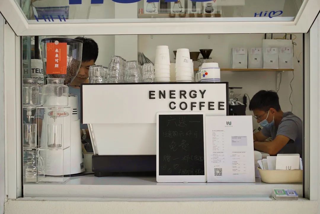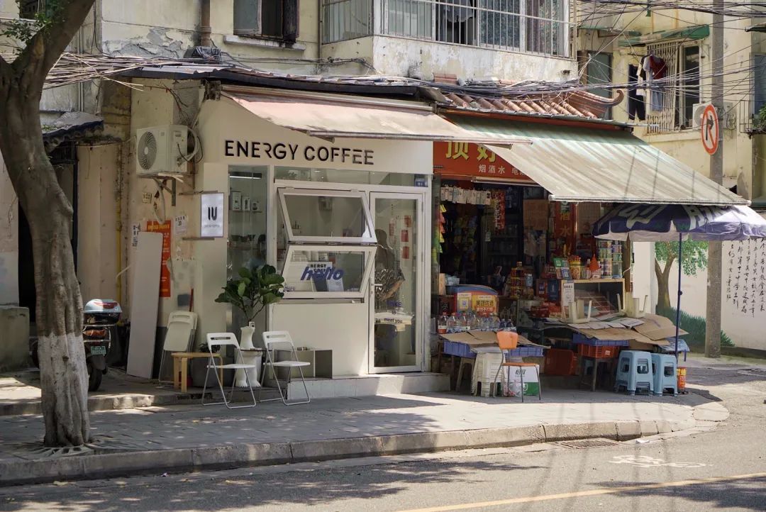 Energy Coffee开在了学校大门斜对面,遮阳篷一打开,不落点阳光下朴素的招牌就不太显眼。幸好通店全白,和隔壁的杂货店形成了鲜明对比。店铺面积依然很小,小到店内只能一个人站进吧台,一个人站在吧台外,一个人坐在吧台前,毕竟前身美甲店也不需要特别宽敞的空间。