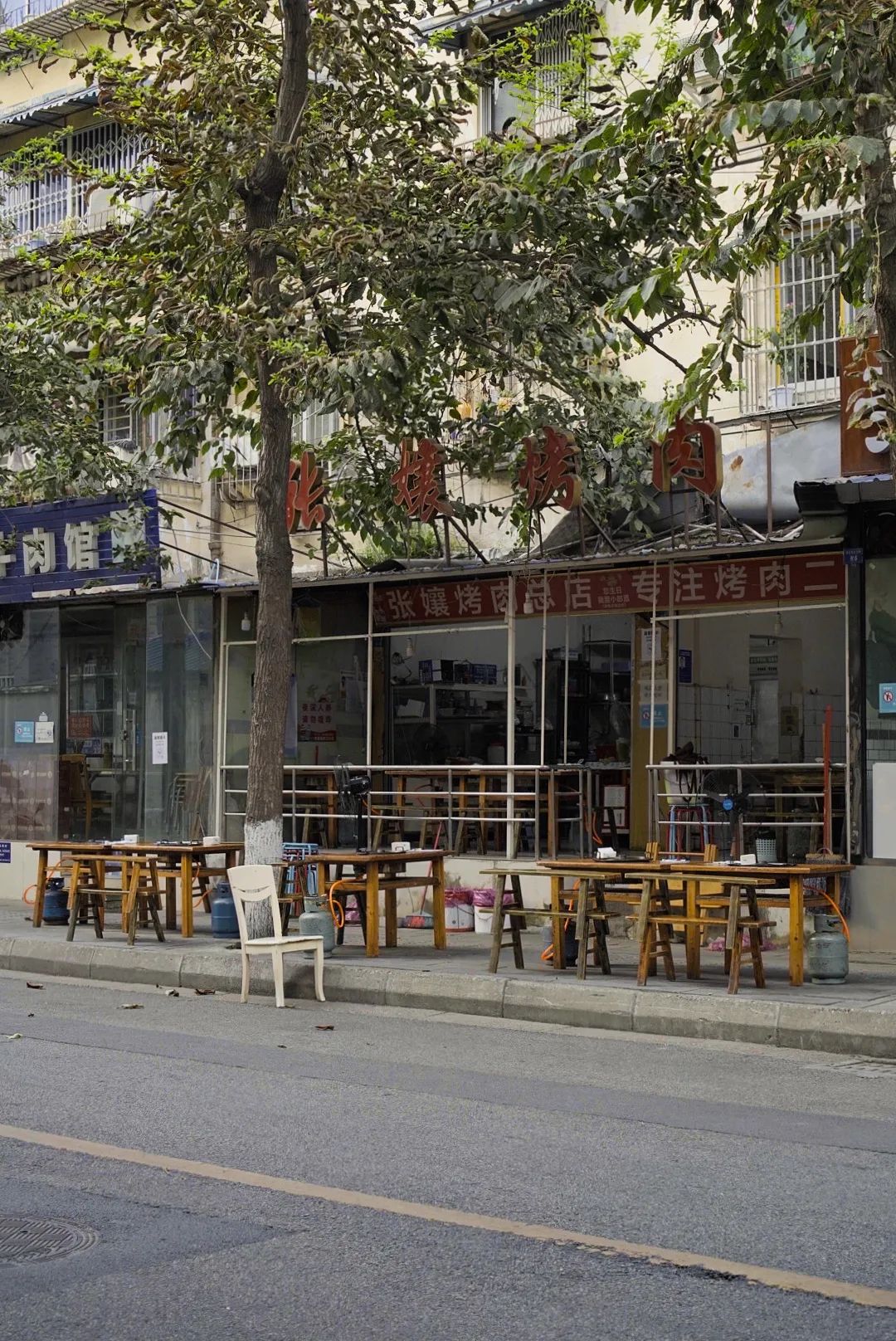 太阳下山,张孃烤肉即将迎来营业高光时刻,暂未上客时,张孃也会和店员拉起板凳坐到街对面耍会儿手机。也或许是在回复提前订了菜的客人,是蒜香排骨,还是泡椒鱼片,一样几份,张孃都记得清清楚楚。