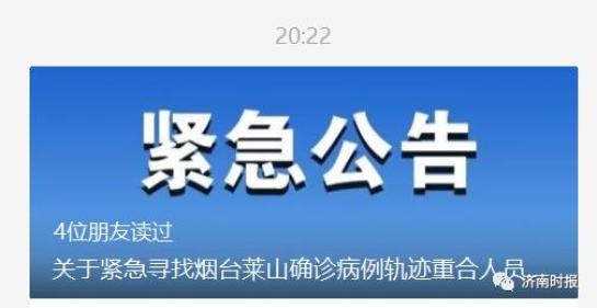 昨晚,“文登发布”微信公众号发布《关于紧急寻找烟台莱山确诊病例轨迹重合人员的公告》——