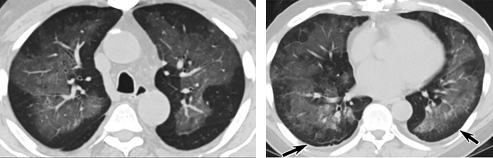 同一病人CT影像显示,中、下肺轴位CT平扫显示毛玻璃样混浊伴胸膜下保留(箭头)疑点二,中国科研工作者从60篇研究论文中筛选出142位电子烟肺炎患者的250张影像图片,邀请3位放射科权威专家,对上述全部影像图片、相关病人临床信息以及文献原文进行了仔细全面研究与审查,发现:16位被文献报道为电子烟肺炎的患者被专家判定为“病毒性感染”,即有可能是新冠肺炎的“疑诊患者”,其中更有5位临床症状和治疗情况相对完整的患者被判定为“中度可疑”。