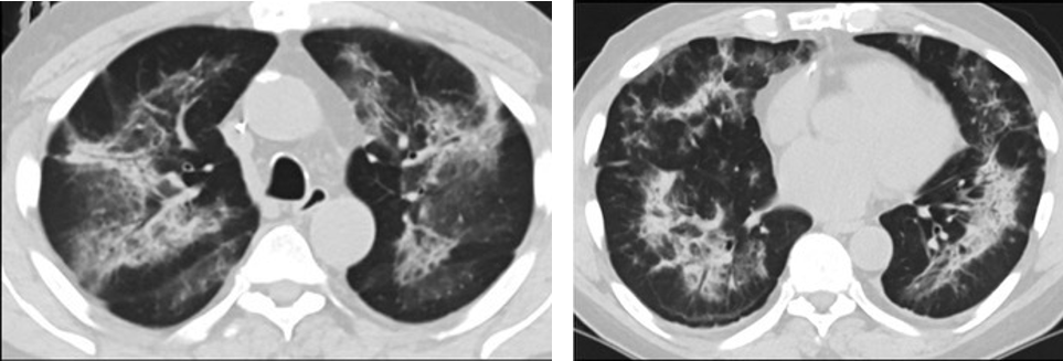 6天后的轴向CT平扫图像显示毛玻璃影变为实变和轻度结构扭曲。(同一病人CT影像)