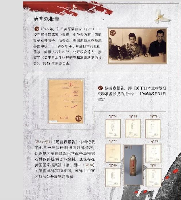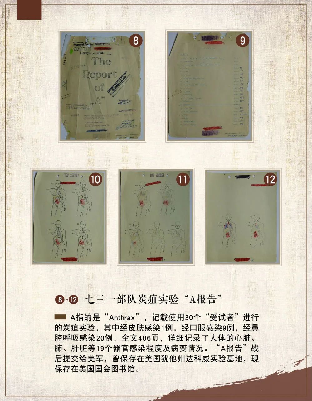 美国国家档案馆II馆保存着美军德特里克堡基地植物实验部主任费尔调查日本细菌战形成的报告《日本细菌战活动最新资料概要》,涵盖了731部队细菌战活动报告书、关于整个细菌战项目的论文,还包括731部队提供的8000个病理切片,700余页的印刷资料,另外还有731部队进行炭疽、鼠疫、伤寒、甲乙型副伤寒、痢疾、霍乱、马鼻疽菌的人体实验报告数据。