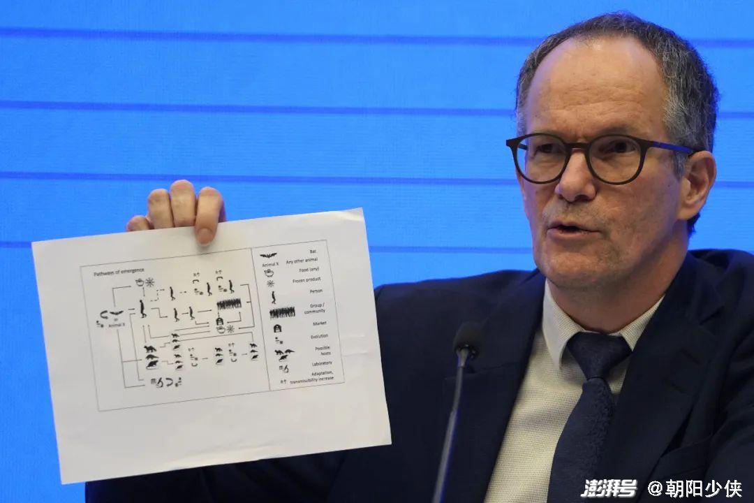 ▲ 2021年2月9日,中国—世界卫生组织新冠病毒溯源研究联合专家组在武汉举行新闻发布会。联合专家组外方组长彼得·本·安巴雷克向媒体展示病毒传播路线图例,认为新冠病毒“比较可能”是经中间宿主引入人类,也“可能”是直接传播或者通过冷链食品引入人类,“极不可能”是通过实验室引入人类。