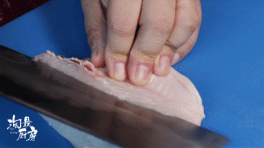 用推的手法可以让鱼片不碎,保持形态。
