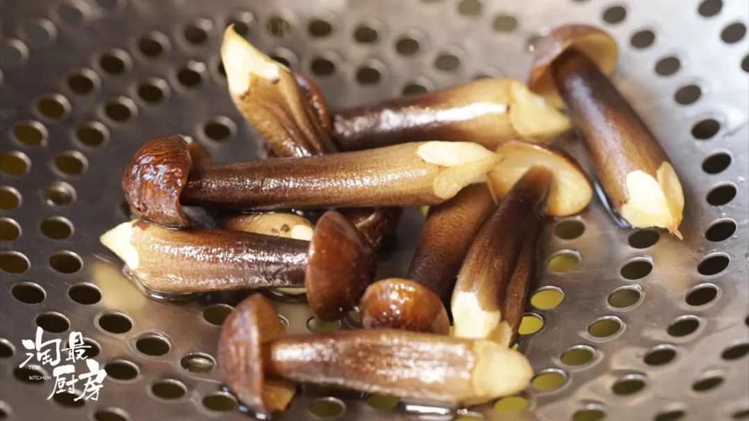 鸡枞菌先滑油,热锅冷油,大概3成油温时放入食材,直到有香味溢散、菌菇断生后捞出。