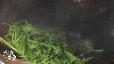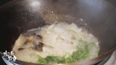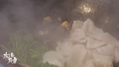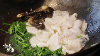 开中火,在8成油温时,荠菜在锅子内煸炒到出水,且体态瘪一点的时候,就可以放入鱼片和鸡枞菌。