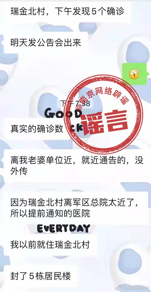 8月3日,有网民在微信群发布“瑞金北村发现5个确诊,封了5栋居民楼”的消息,引发部分民众担忧。经向秦淮区疫情防控指挥部了解核实,实际情况是8月2日,秦淮区瑞金路街道解放路68号一名机场员工阳性病例确诊(7月24日已转运至集中隔离点),区疫情防控指挥部立即将其同住的5名家属转运至隔离酒店实施集中隔离。并不存在确诊5个病例及封控五栋楼的情况。2.邵阳市隆回县怡然花园出现阳性病例?