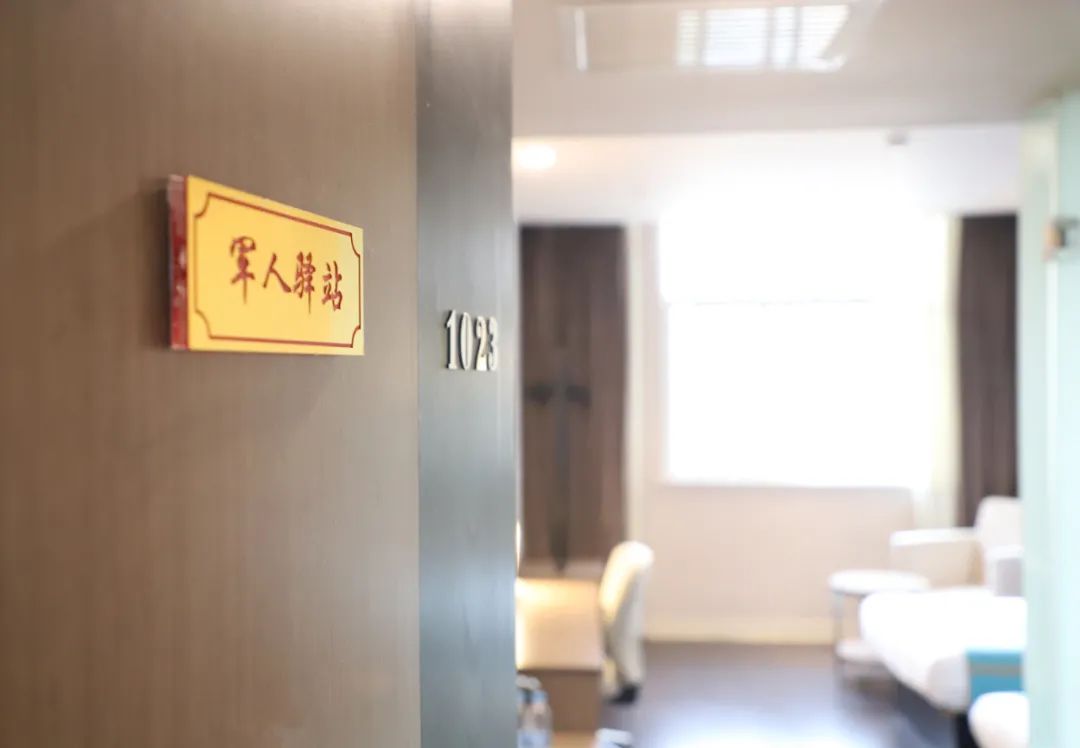 一到酒店,门口悬挂的“军人驿站”金色牌匾在阳光下熠熠生辉。大堂里“军人、消防救援人员优先”、“军人驿站入住须知”等宣传海报十分抢眼,拥军氛围浓厚。