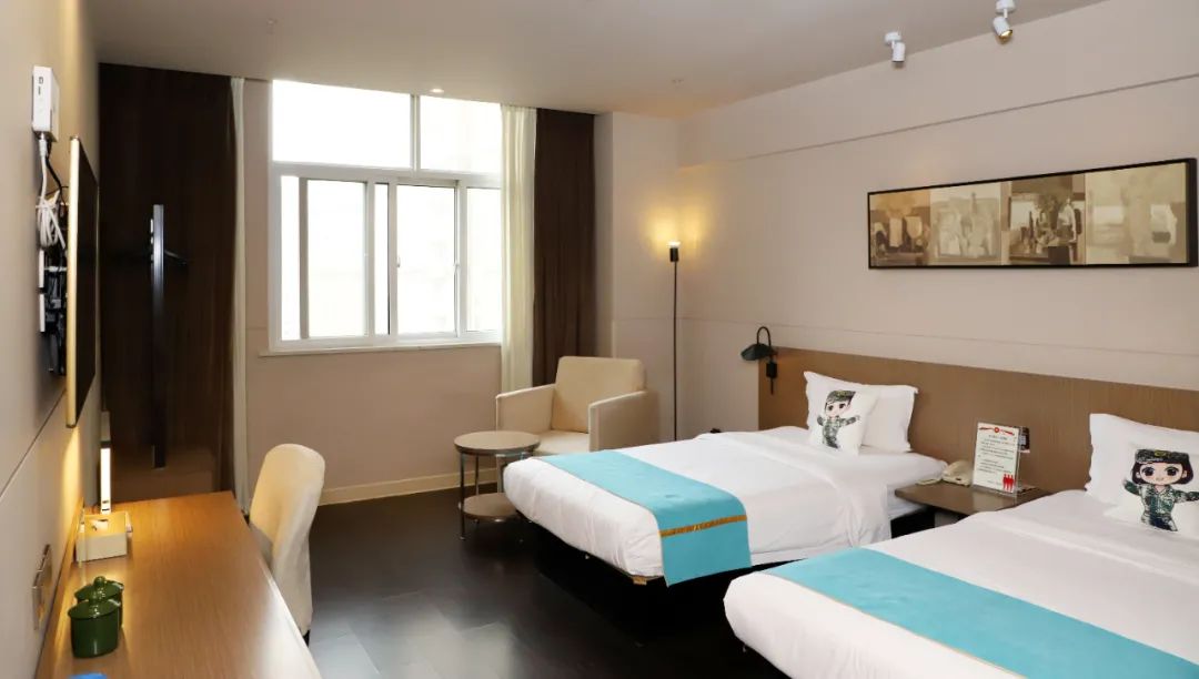 进入客房,门上“军人驿站”牌子仪式感十足,房间内浓厚的军旅氛围更是扑面而来:床上军旅卡通抱枕异常抢眼,床头柜上海军陆战队小公仔又萌又可爱,桌上竟然还有绿色军用口杯,真是细节满满啊!房间装修更是风格清新,让人感到舒适恬静,窗户还可以俯瞰古城景色。
