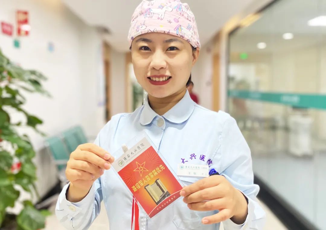 口腔科护士王悦展示退役军人及家属优先标牌拍完片子,因为老班长牙床有炎症,需消炎才能做进一步治疗。护士王悦又帮着约了下次的治疗时间。就诊期间,导医护士王悦一直陪在旁边。整个就诊过程不到30分钟。微笑的一对一导医专员、优先的就诊服务、人性化的就诊专区及舒适的就医环境,让老班长真切感受到了对退役军人的尊重和优待。