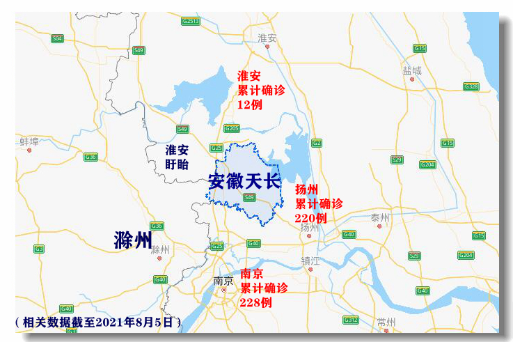也就是说,安徽天长几乎是被江苏南京、扬州和淮安三市四面包围。而在当下,江苏疫情防控的“主战场”也正是在上述三市。